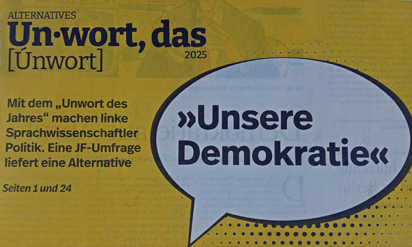 Gegenentwurf: Auch die JUNGE FREIHEIT, die Wochenzeitung für Debatte, wählte wieder ein Unwort. Die verpönte Floskel lautet „unsere Demokratie“. Um die 70.000 Bürger nahmen an der Aktion teil. Mehr als 42.000 Stimmen, 60,4 Prozent, stimmten für „unsere Demokratie“ zum Unwort des Jahres 2025. Auf den nächsten Plätzen „Sondervermögen“ und „Nichtregierungsorganisationen“.